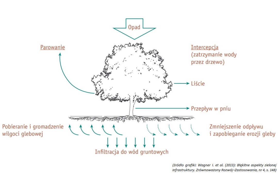 Drzewa pomagają ograniczyć odpływ wody deszczowej na kilka sposobów. Jednym z nich jest przechwycenie padającego deszczu i zatrzymanie jego części na liściach i korze. Część tej przechwyconej wody wyparuje, a część będzie stopniowo uwalniana do gleby. Na powierzchni gleby opadłe liście drzew pomagają tworzyć gąbczastą warstwę, która m.in. pomaga utrzymać wilgotność gleby. Dzięki tej warstwie woda deszczowa woda deszczowa wnika w głąb gleby wolniej. Dodatkowo tak przesiąkająca woda oczyszczana jest z zanieczyszczeń. Pod ziemią korzenie utrzymują wodę w glebie, częściowo ją pobierając i która ostatecznie zostanie uwolniona do atmosfery w wyniku transpiracji [6].