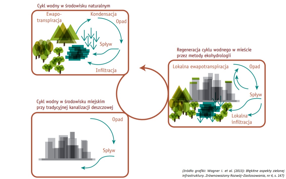 W mieście tzw. „szara” infrastruktura (budynki, ulice, chodniki, parkingi, place miejskie oraz utwardzona i zdegradowana gleba) stanowi barierę dla wody. Nie mając możliwości wsiąknięcia, woda deszczowa płynie po powierzchni. Przy obfitych opadach przepustowość studzienek kanalizacyjnych jest niewystarczająca, więc dochodzi do podtopień i powodzi. Odpływ powierzchniowy powoduje deficyty wody często już kilkadziesiąt godzin później. Aż 70% wody deszczowej (a przy intensywnych opadach nawet 90%) jest bezpowrotnie tracona z przestrzeni miasta [6]. Zatem duże ilości wody opadowej w mieście najpierw sieją spustoszenie, a następnie ulegają zmarnowaniu. Sytuacja byłaby zgoła inna, gdyby w pierwszej kolejności woda ta została odpowiednio zagospodarowana.